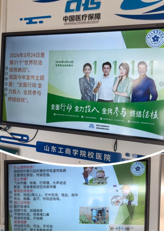 在门诊大厅、走廊显眼位置张贴宣传海报;启用电子屏滚动播放结核防治科普内容;依托校医院微信公众号,定期推送校园防控要点、日常防护技巧、症状识别与规范就医等权威科普内容;门诊医师利用诊治间歇,一对一为就诊师生普及防护知识,将健康提醒融入日常诊疗,实现多维覆盖、常态宣教。
